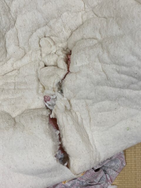 こんなに厚さがある中綿なのに綿が裂けている!あかんやろ!!