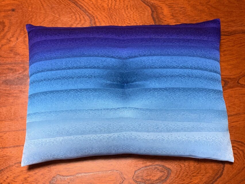 「丹後ブルー」でご友人のガラス作品を鎮座させるミニ座布団を作らせていただきました。ガラスの輝きにシルクの丹後ブルーが負けていませんね~~~