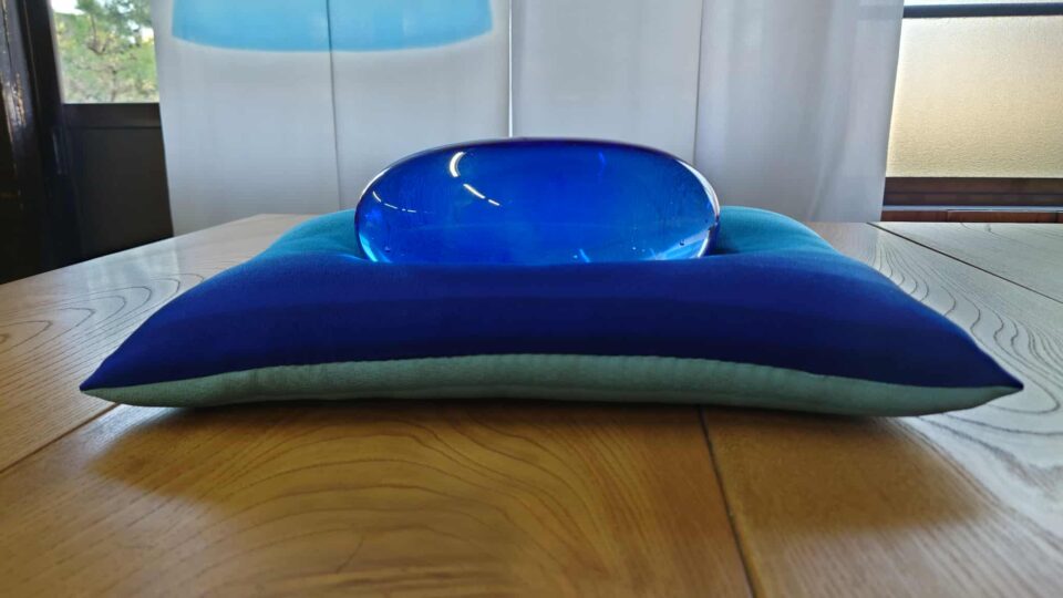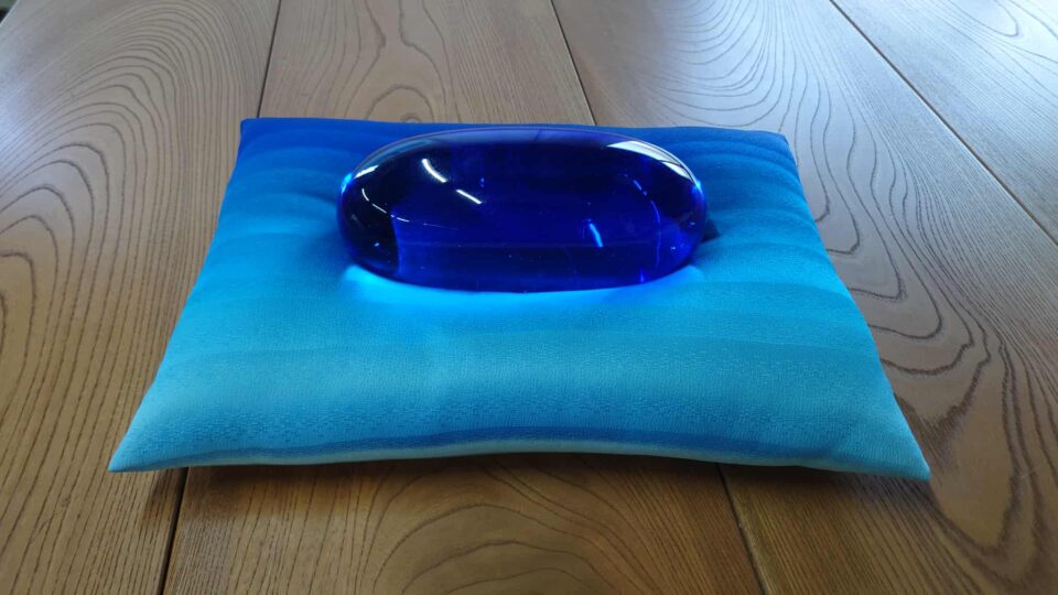 「丹後ブルー」でご友人のガラス作品を鎮座させるミニ座布団を作らせていただきました。ガラスの輝きにシルクの丹後ブルーが負けていませんね~~~