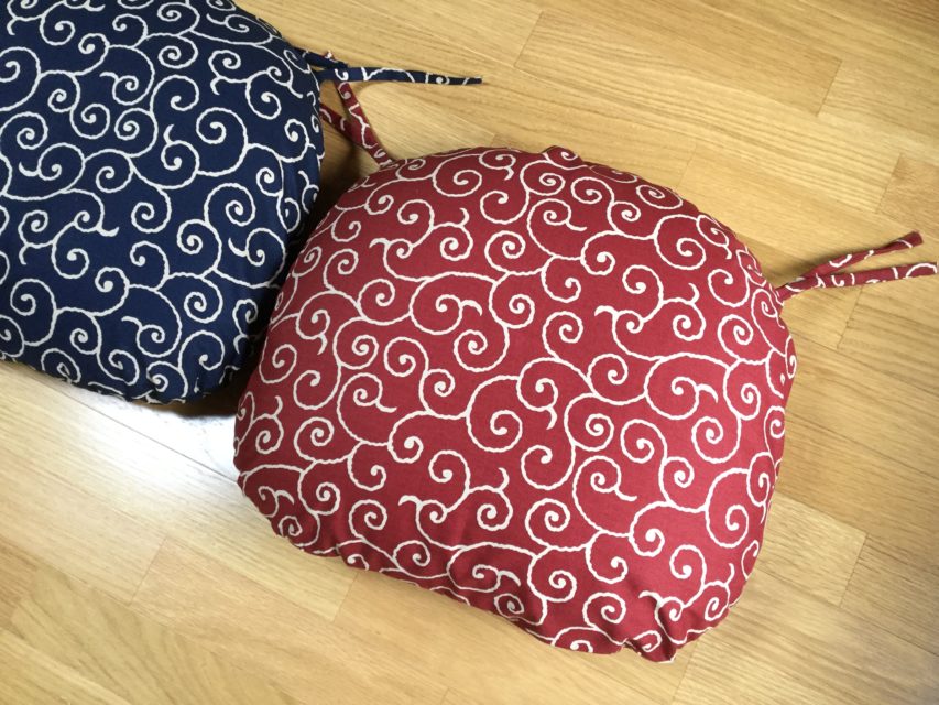 中袋を作り綿入れをし、洗濯ができるようにファスナー付のカバーをかける形態にしまし、椅子から座布団がずれないように 椅子に結び付けるひもをつけました。