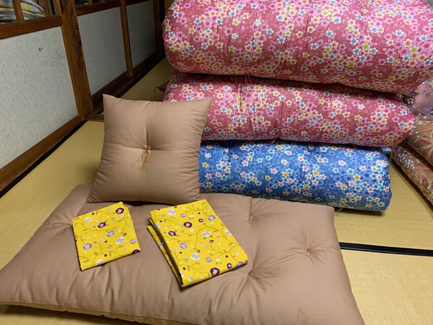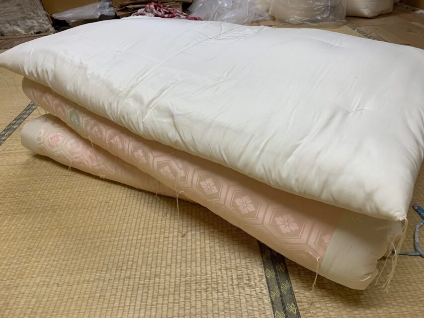 「50年前の私の婚礼ふとんです」と持ち込まれたセミダブルサイズの敷ふとんです。奥様が結婚される頃はお客さん用ふとんの敷ふとんはセミダブル(120×200)に作ることがあったそうだ。