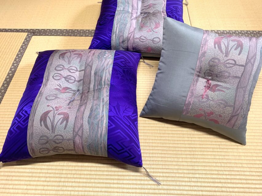55×59㎝の座布団は名古屋帯を中央に、紫の色無地を合わせてオシャレな座布団にリメイクです。名古屋帯の残りの生地で45×45㎝のクッション一つ。