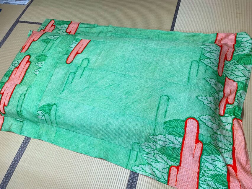 総絞りの緑の振袖 長襦袢も付け下げに柄を付けた総絞り 表に振袖、裏に長襦袢のバットカバーです。