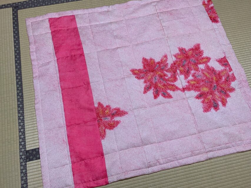 着物一枚から115×160~170(着物の身丈)程度のブランケットです。着物はシルク100%のちりめんで、ブランケット両面は着物の表の生地だけで作ります。中綿などは入れません。「シルクだから扱い方が分からない」と怖がっていらっしゃる声がありますが、大丈夫ですよ。
